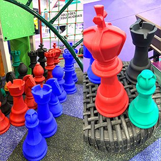 O Jogo de Xadrez Gigante da Krenke é formado por um conjunto de 32 peças em escala gigante com a figura do REI medindo 75 cm de altura e 33 cm de diâmetro na base (peça maior) e o PEÃO medindo 45 cm de altura (peça menor).