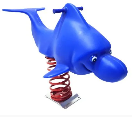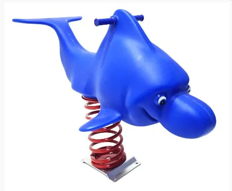Descrição: Brinquedo infantil sobre mola em formato de golfinho com a seguinte descrição: peça de plástico polietileno rotomoldado na cor azul, 320mm de largura total, 960mm de comprimento e 520mm de altura até o assento, em formato de motocicleta; mola feita com aço galvanizado a fogo com Ø20mm de diâmetro, revestido com pintura eletroestática, 400mm de altura e 200mm de largura; suporte âncora feito com aço galvanizado a fogo, para fixação da mola no brinquedo e para fixação da mola dentro ou sobre o concreto ou terra;