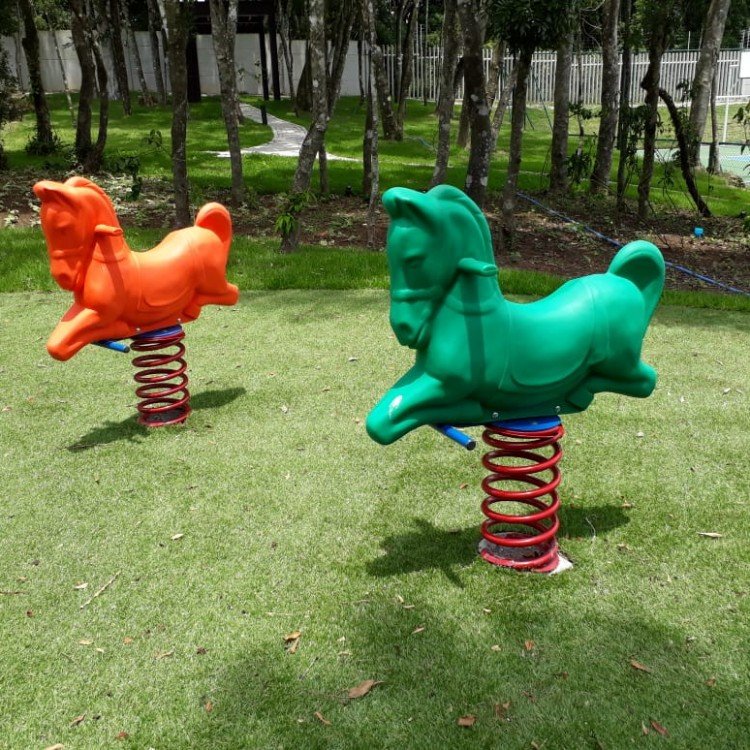 Descrição: Brinquedo infantil sobre mola em formato de cavalo com a seguinte descrição: peça de plástico polietileno rotomoldado, 690mm de largura total, 1200mm de comprimento (do bico a cauda) e 530mm de altura até o assento, em formato de cavalo; mola feita com aço galvanizado a fogo com Ø20mm de diâmetro, revestido com pintura eletroestática, 400mm de altura e 200mm de largura; suporte âncora feito com aço galvanizado a fogo, para fixação da mola no brinquedo e para fixação da mola dentro ou sobre o concreto ou terra;