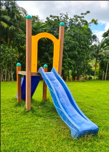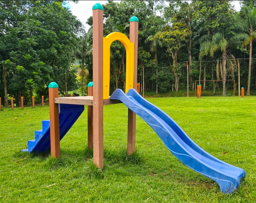 O produto vêm com a configuração inicial de uma escada, plataforma e escorregador.