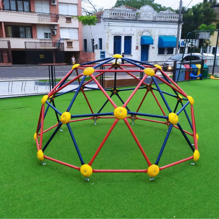 É fabricando com material de ferro tubular galvanizado e pintado com tinta a pó sem materiais pesados medindo 2,70 m de diâmetro com altura 1,40 m.